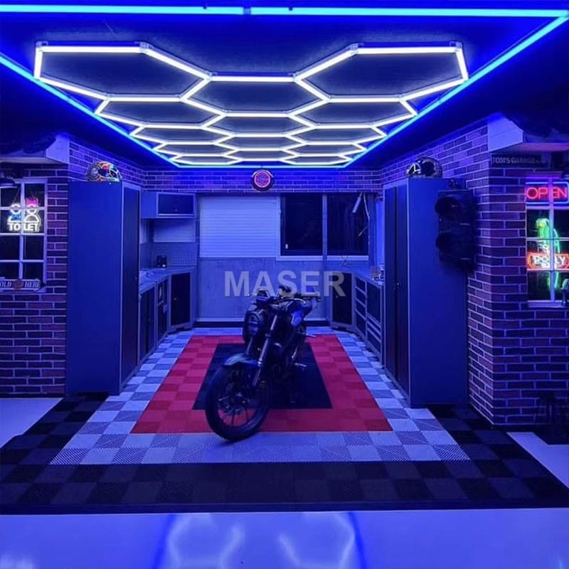 This 14 hexagon lights with blue border are top in terms of popularity among our product lines. It measures 16 x 8 feet in size and is equipped with 14 bright LED hexagonal light, along with a blue LED border. It is easy to assemble and can be either hung up or installed with screws, making it suitable for any garage environment. In the automotive field and the precision operation industry, this hexagon led lighting are highly favored. If you are looking for a lighting solution that combines a sense of luxury, a modern style, and is extremely bright and practical, then it is undoubtedly an excellent choice!