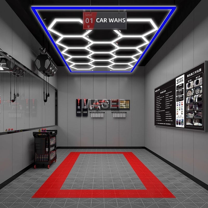 Hexagon ceiling light is versatile and can be used for a variety of scenes, including automotive shops, auto body shops, auto detailing shops, auto repair shops, car wash shops, workshops, garages, car showroom and more.