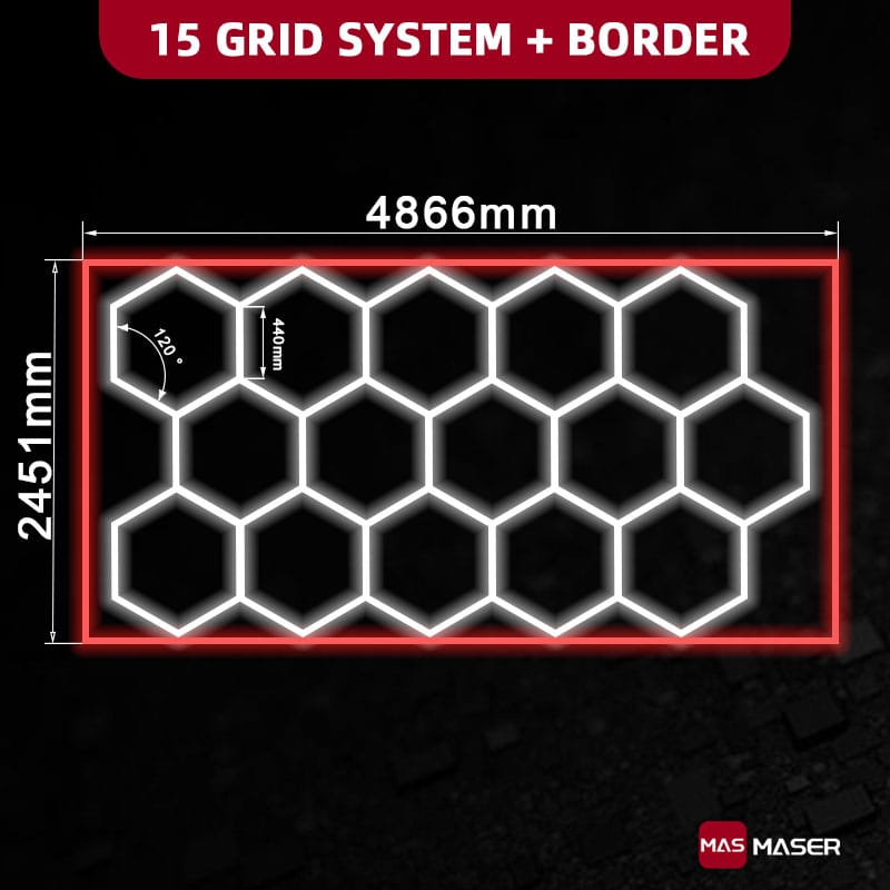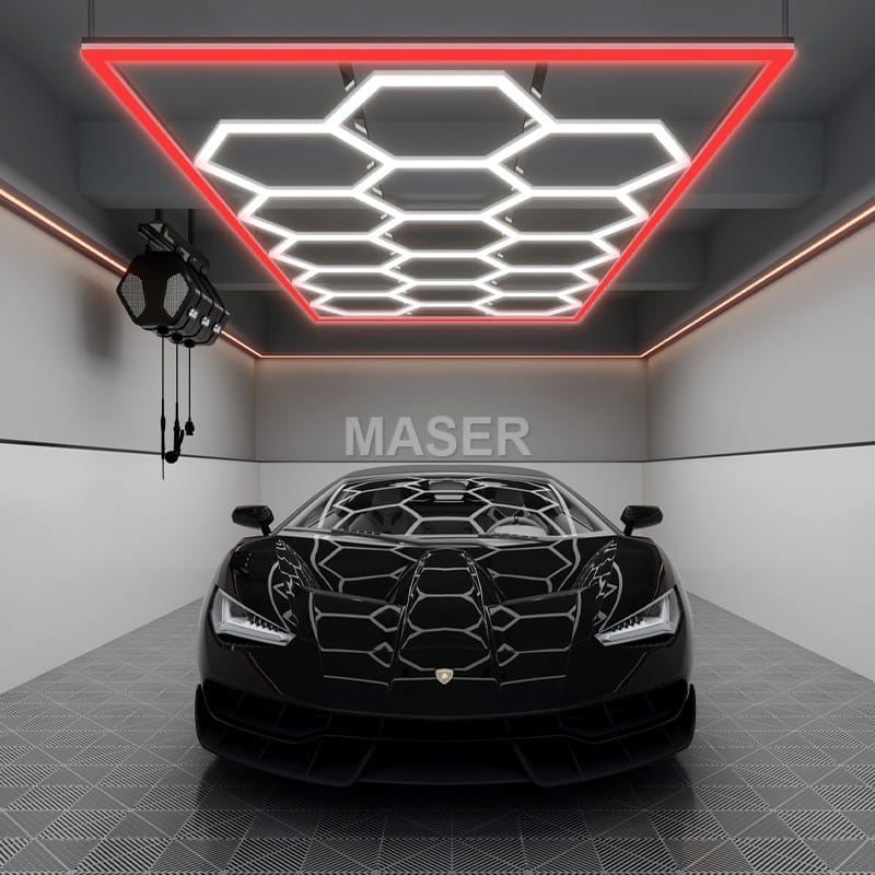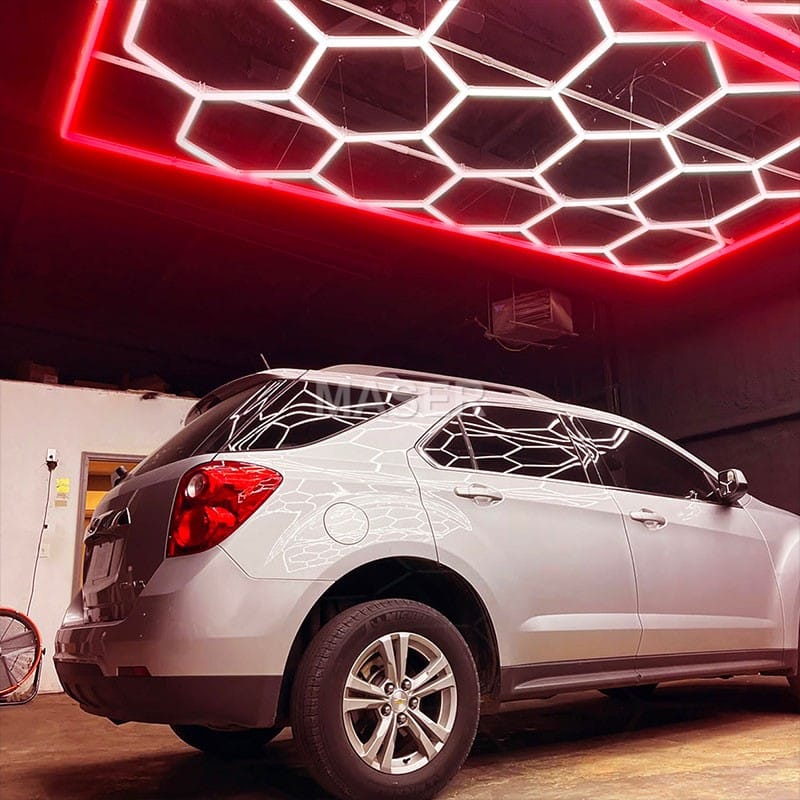 This 15 hex lights with red border are top performer in terms of popularity and versatility among our product lines. It measures 16 x 8 feet in size and is equipped with 15 bright LED hexagonal light, along with a red LED border. It is easy to assemble and can be either hung up or installed with screws, making it suitable for any garage environment. In the automotive field and the precision operation industry, these detailing hexagon lights are highly favored. If you are looking for a lighting solution that combines a sense of luxury, a modern style, and is extremely bright and practical, then it is undoubtedly an excellent choice!