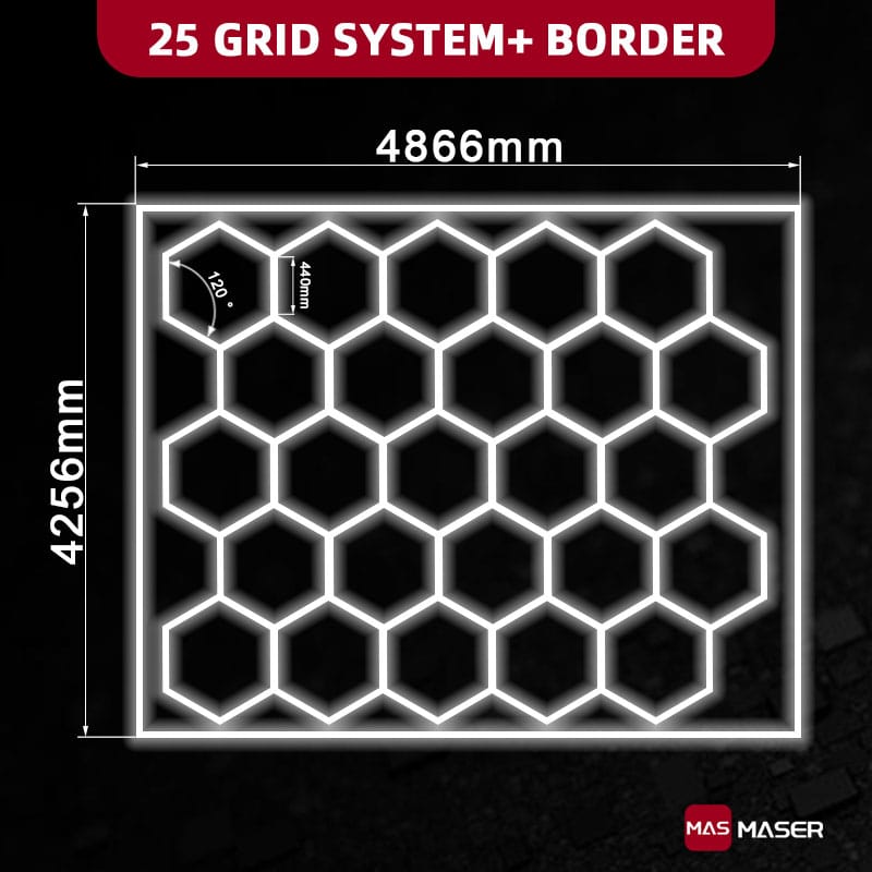 Our highly popular and multi functional hexagon lights, it measures 16 x 13.96 feet. 25 hexagon lights system with border is perfect for garage. These honeycomb light fixtures are incredibly easy to assemble. You can either hang them or use screws to install, allowing for flexibility to suit any garage, underground parking lot, or car beauty shop. These industrial garage lights are extremely popular in the automotive and detailing industries and are undoubtedly an ideal choice. If you are looking for a luxurious and modern lighting solution that combines extreme brightness and excellent functionality, these hexagonal lights are definitely worth your attention.