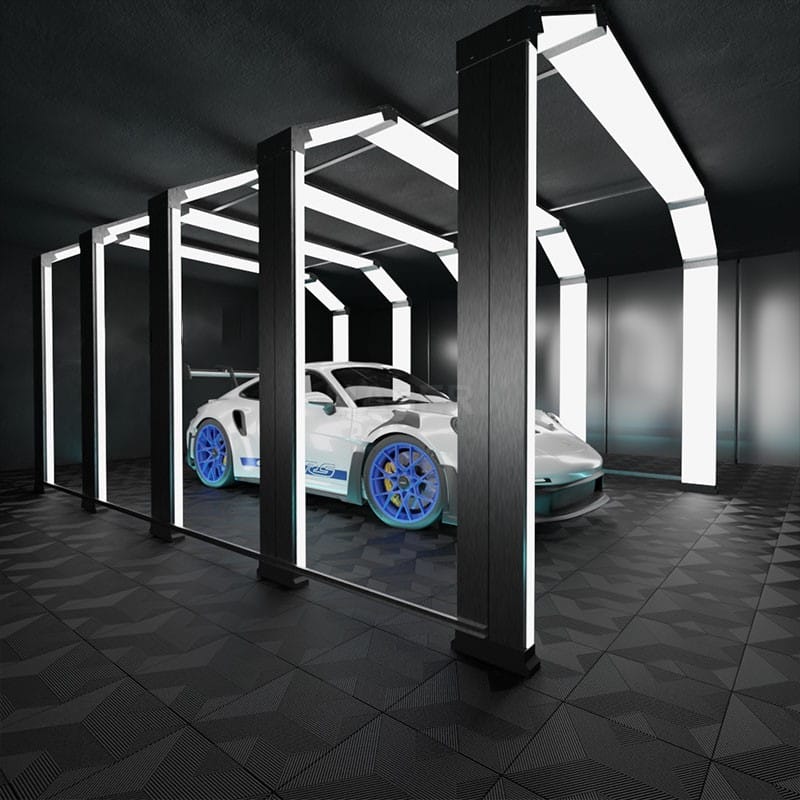 5 grid automotive inspection tunnel features a five arch design, integrating a 360° high CRI light curtain and an intelligent dimming system. The industrial grade shadowless illumination simulates natural daylight, while uniform light spots eliminate paint color deviation for seamless film application and paint correction. The automotive inspection tunnel light is made of an aluminum frame and polycarbonate material, combining durability, a modular design, and a minimalist aesthetic. Standard power transformer supports universal sockets for plug and play operation.