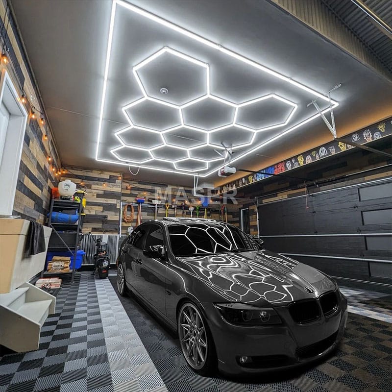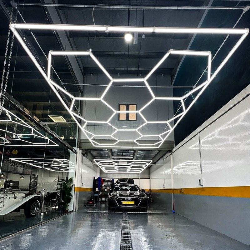 Hexagon LED ceiling light is versatile and can be used for a variety of scenes, including automotive shops, auto body shops, auto detailing shops, auto repair shops, car wash shops, workshops, car showrooms and more.