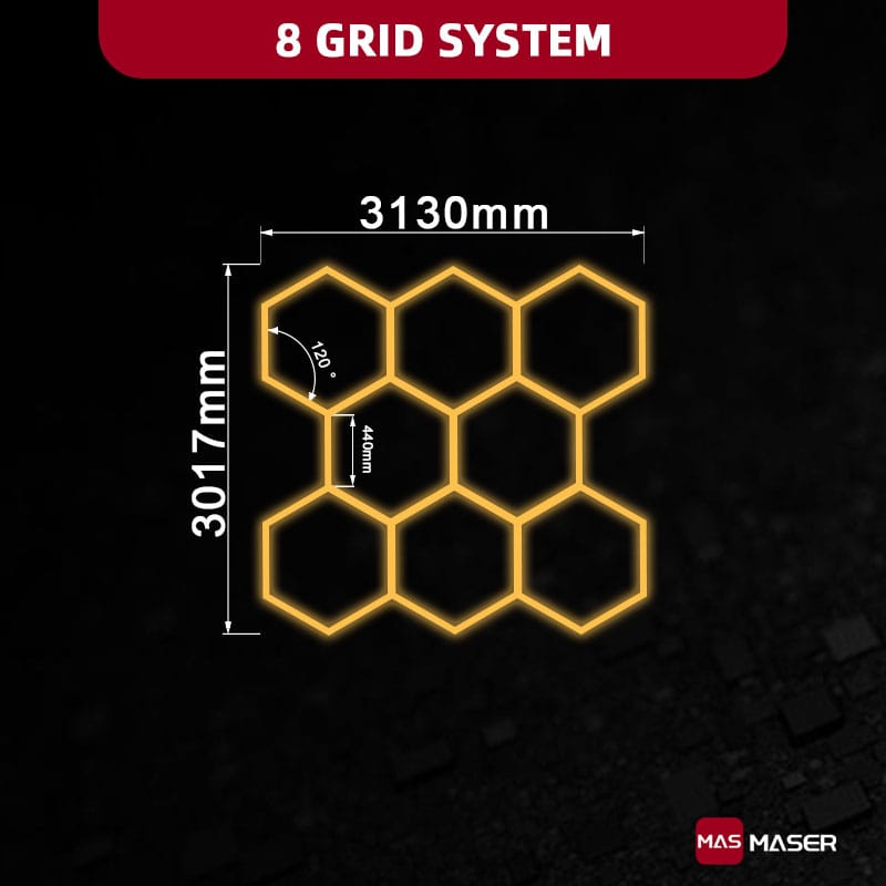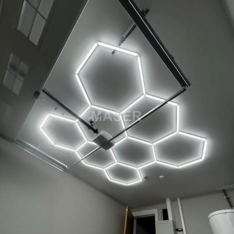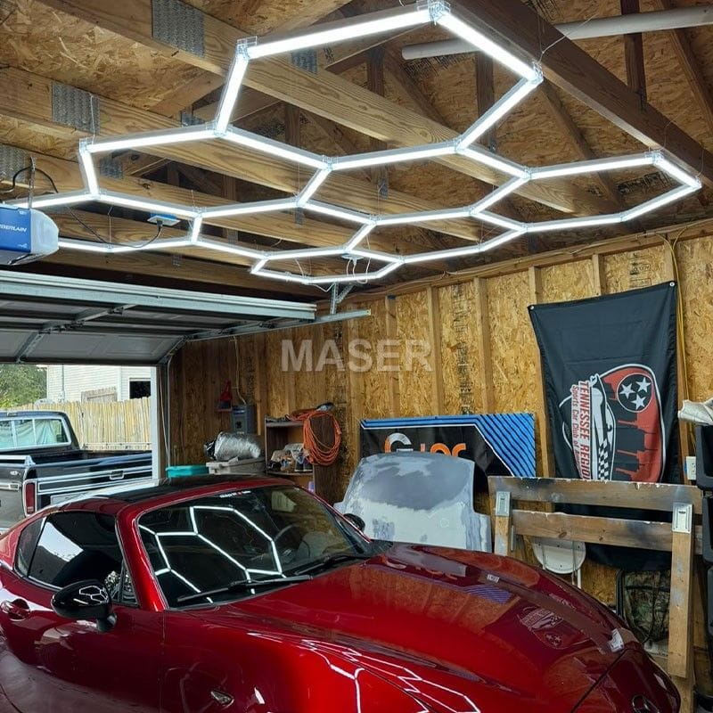 Our hexagonal lighting kit, which incorporates the 5CCT 8 hexagon lights system, ideals for garage and workshop. Measuring 10.27 × 10 feet, it is equipped with 8 high brightness garage led ceiling lights, forming an aesthetically pleasing and functional lighting setup. Honeycomb lights garage work light is easy to install, whether you prefer to install it by hanging or with screws, it can be seamlessly connect into any garage layout.