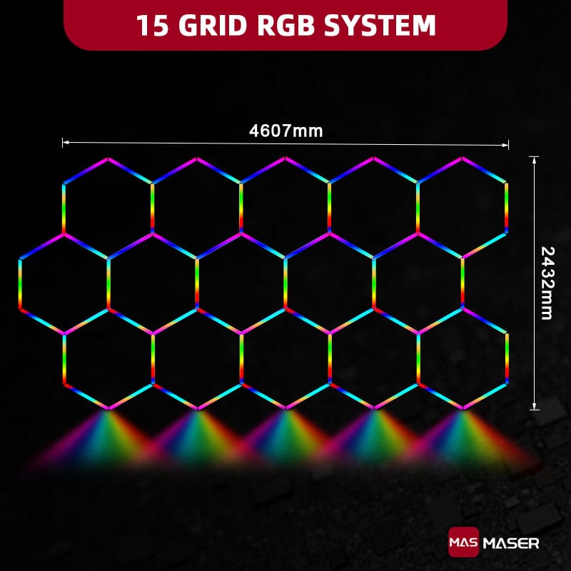 RGB 15 hexagon lights system is equipped with dynamic RGB color changing LED light. RGB ceiling lights are sized of 15.11 × 7.98 feet, ideals for gym, garage and bar. The installation is extremely easy. You just need to connect the components and plug in the power supply, and then you can enjoy hundreds of color modes and charming lighting effects. This hexagon ceiling lights RGB LED light is come with a remote control, enabling you to switch colors and modes easily. In addition, it has a super cool music synchronization function, allowing the lights to dance vividly along with the rhythm of the music.