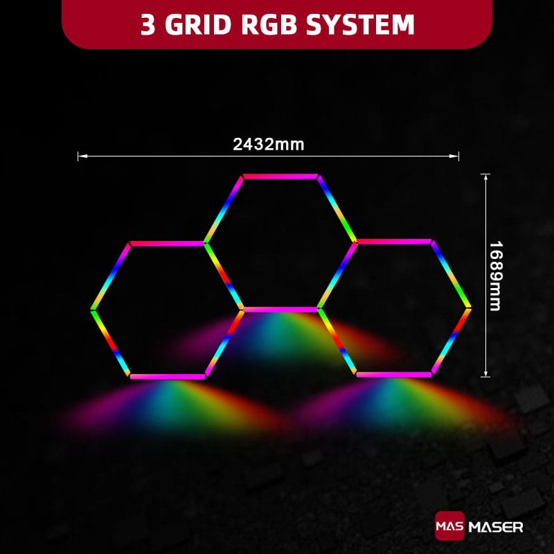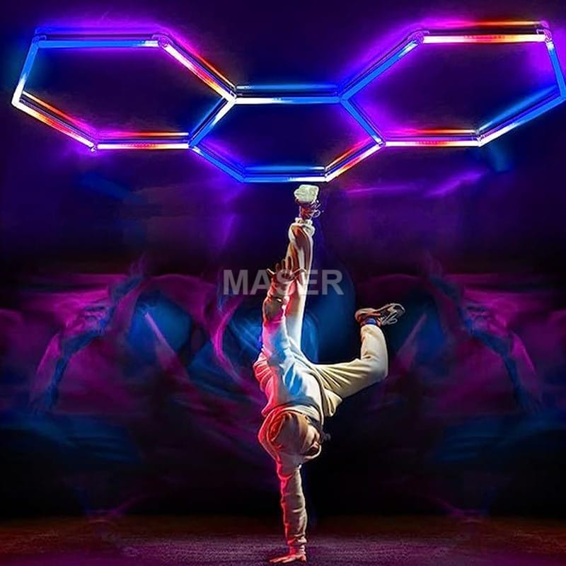 Multi coloured hexagonal LED roof light is versatile and can be used for a variety of scenes, including automotive shops, auto body shops, auto detailing shops, auto repair shops, car wash shops, workshops, garages, showrooms, gyms, gaming, barber shop, supermarket and more.